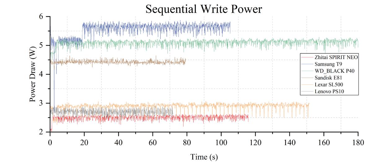 从下面的平均功耗图表中可以看到,三星、西数和闪迪这3款桥接方案的PSSD,在顺序写入时的功耗也要明显更高,原生主控方案的3款国产PSSD则有极其明显的功耗优势。