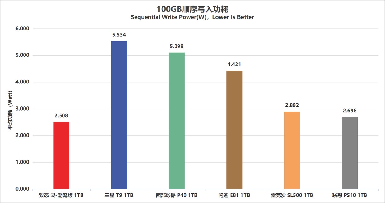而致态、雷克沙和联想的写入功耗明显低得多,可以说优势一目了然。