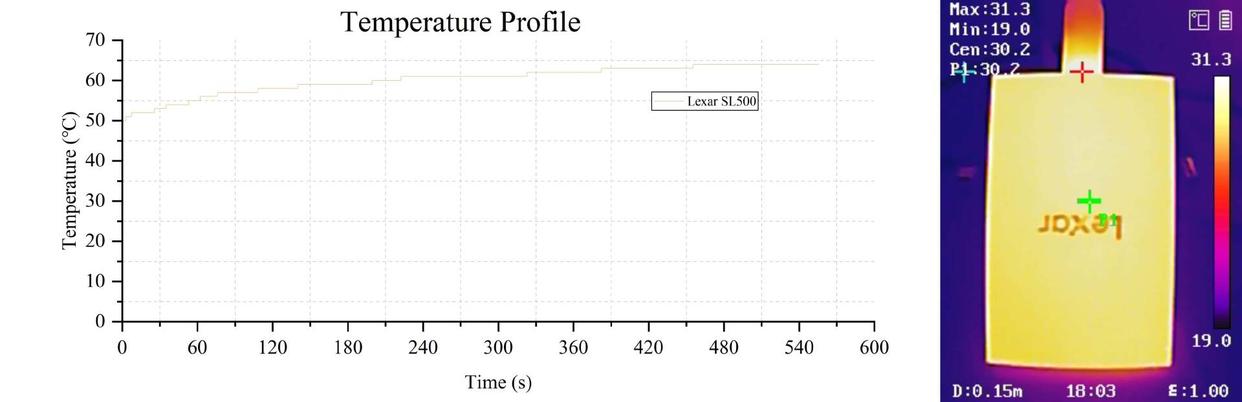 (5)雷克沙SL500,传感器温度最高为64℃,不知道是不是故意的,我发现它的金属外壳没咋发挥导热作用,外壳最高点是接口位置附近的31.3℃,外壳中心温度为30.2℃。