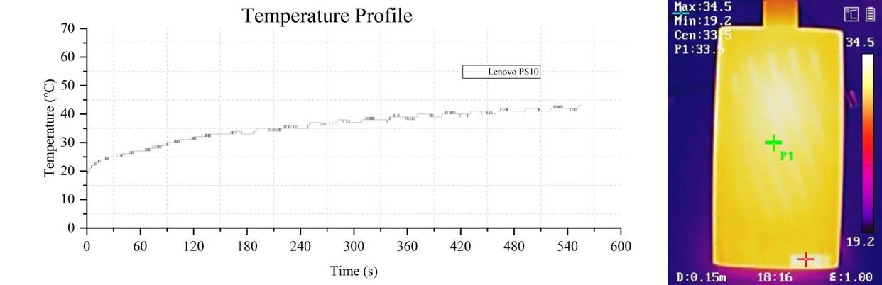(6)联想PS10,传感器温度最高为43℃,外壳温度最高处为34.5℃,外壳中心位置的温度为33.5℃,感觉和雷克沙似的也没咋利用金属的导热机制,不知道是不是怕使用时烫手。