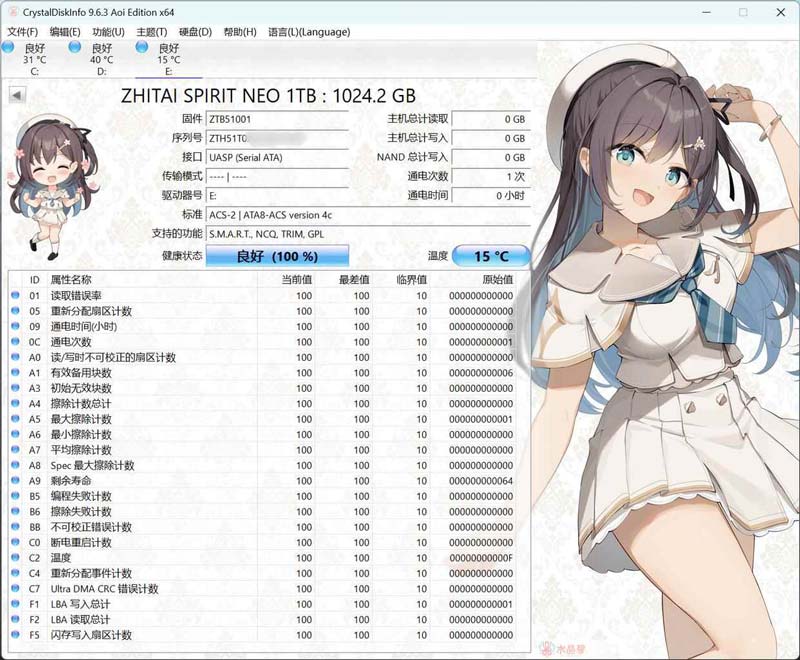 S.M.A.R.T信息显示,致态灵·潮流版接口为UASP (Serial ATA),结合它远超SATA3.0的读写速度,可以判定它和普通移动硬盘盒的桥接芯片+NVMe SSD的硬件方案不同,而是采用了原生主控方案,在使用时功耗更低,更适合手机、平板等设备使用。