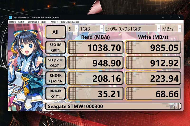 首先是代表空盘状态表现(峰值数据),使用CrystalDiskMark8,测试结果如下图所示: