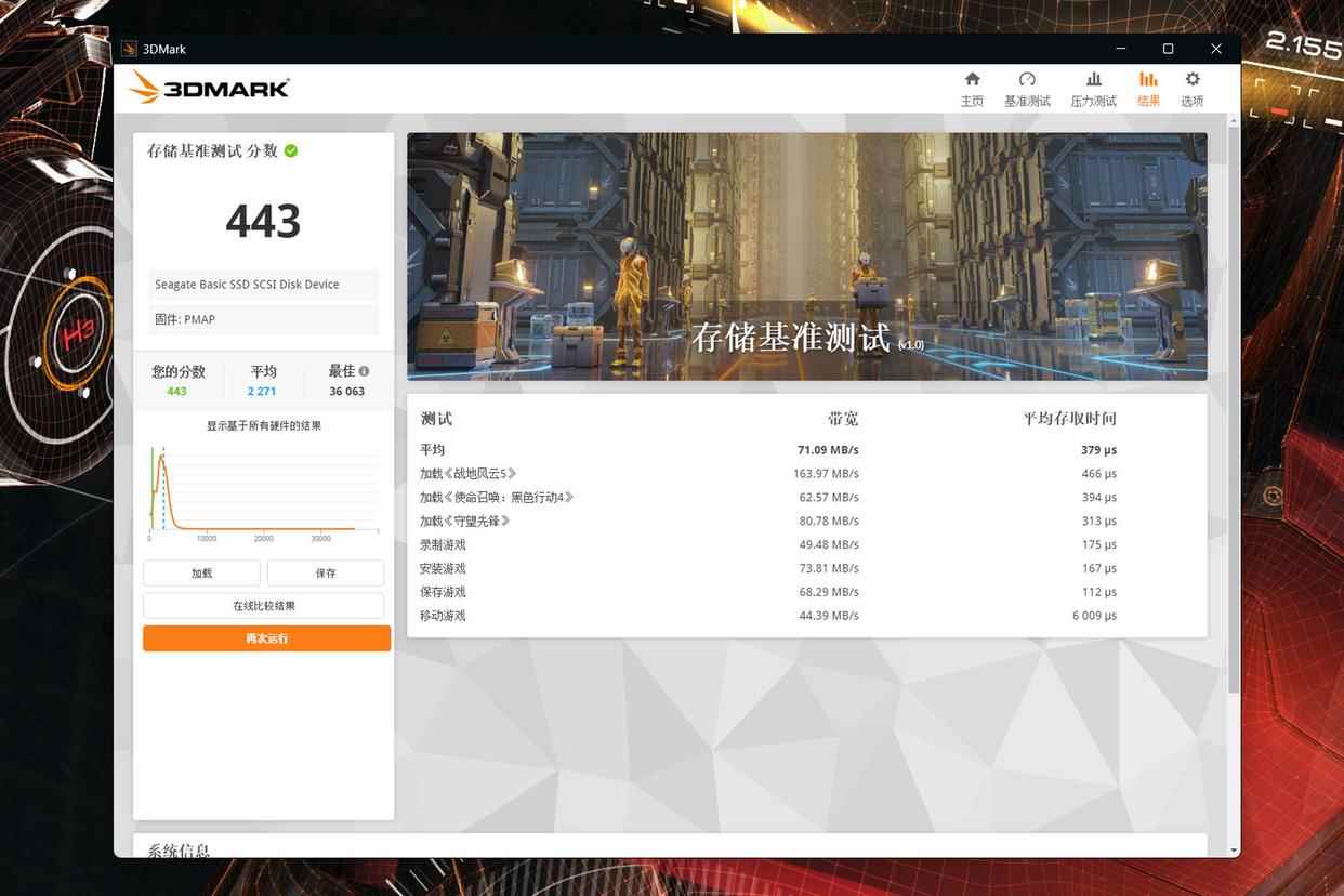 最后是游戏表现,使用3DMark的存储基准测试模组,测试结果如下图所示: