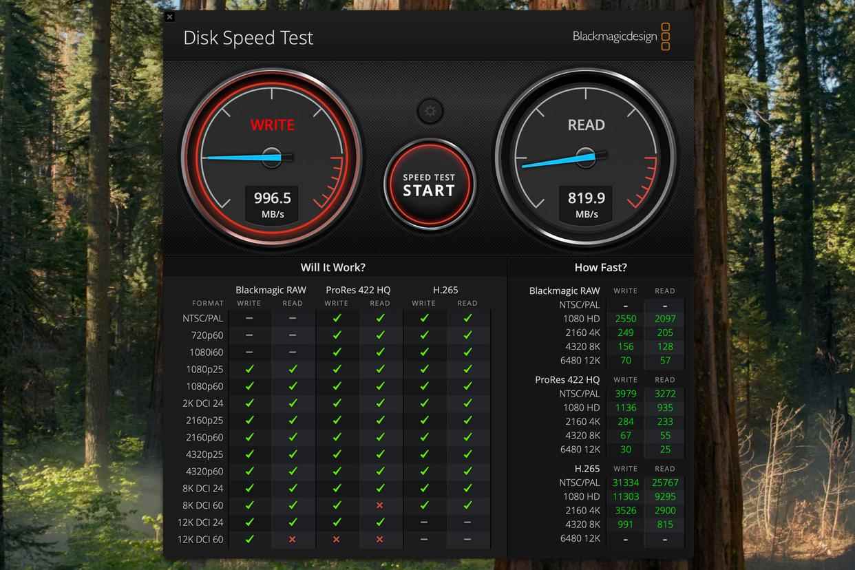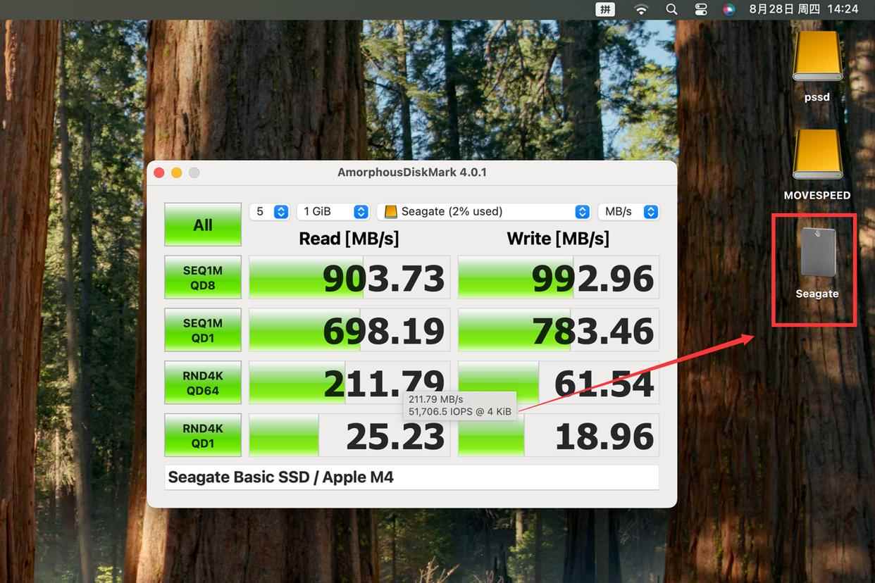 未格式化的前提下,将希捷小翼移动固态硬盘接入MacMini进行测试,软件使用BlackMagic的Disk Speed Test,测试结果如下图所示: