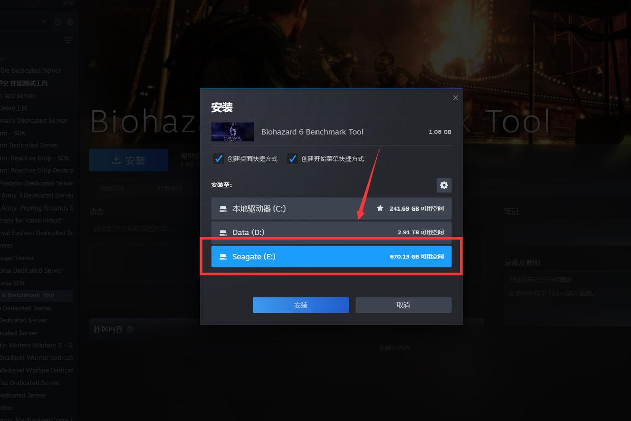 硬盘对游戏的影响体现在1%low帧这项数据上,这里使用生化危机6官方Benchmark+游戏加加进行监控。