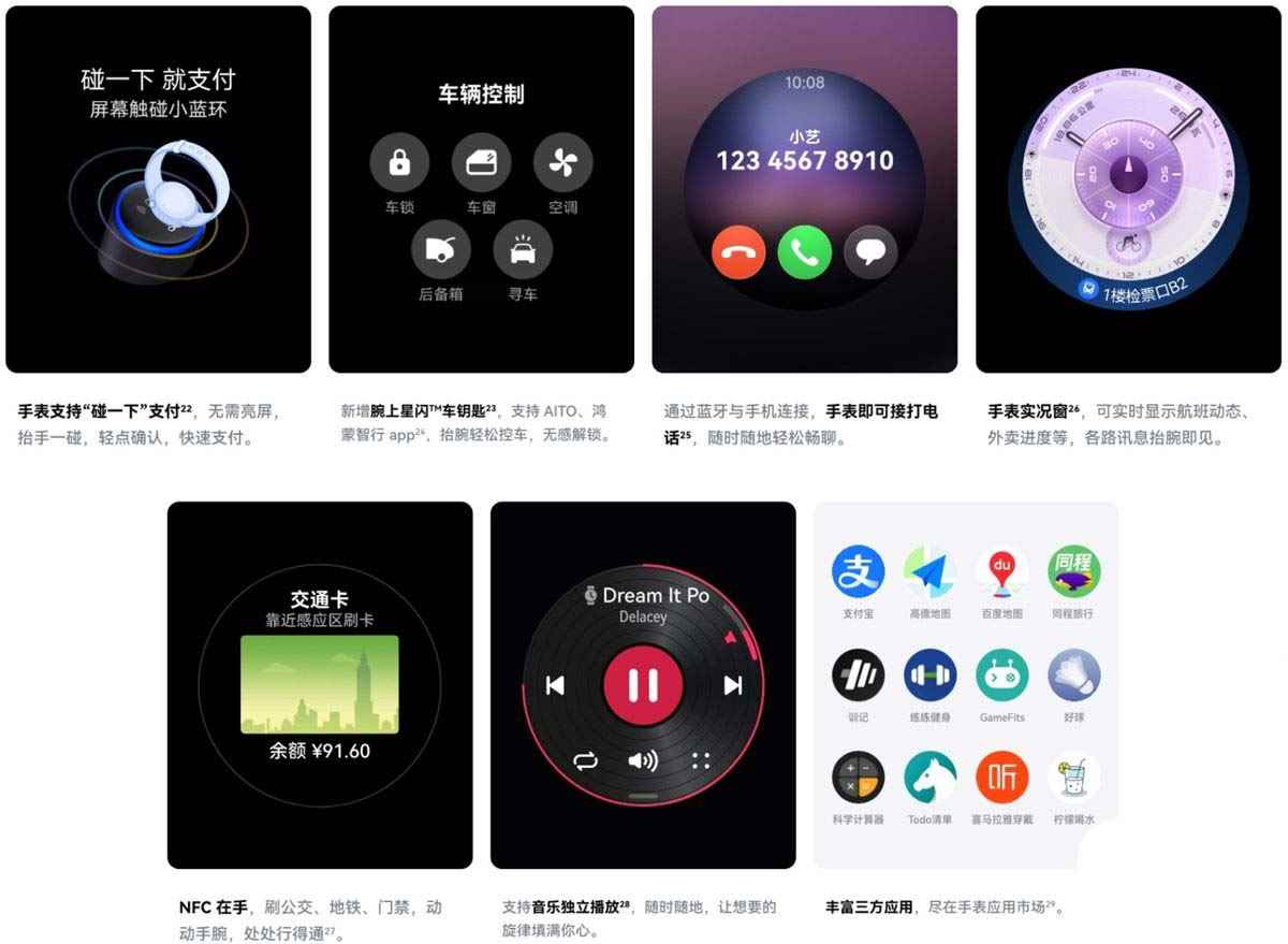HUAWEI WATCH GT 6 智能手表还支持支付宝碰一碰支付、腕上星闪车钥匙、蓝牙接打手机电话、手表实况窗、交通卡、音乐播放、第三方 App 安装使用等。