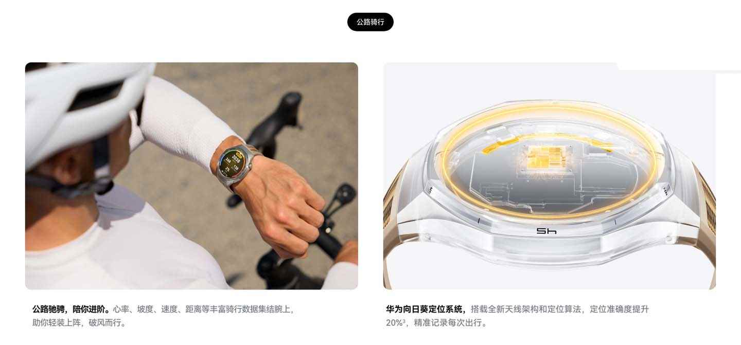 HUAWEI WATCH GT 6 内置华为向日葵定位系统,搭载全新天线架构和定位算法,定位精准度提升 20%;手表无需配对功率计,可智能测算骑行模拟功率,调整运动节奏和强度;配对功率计和测算 FTP,精准评估骑行能力。