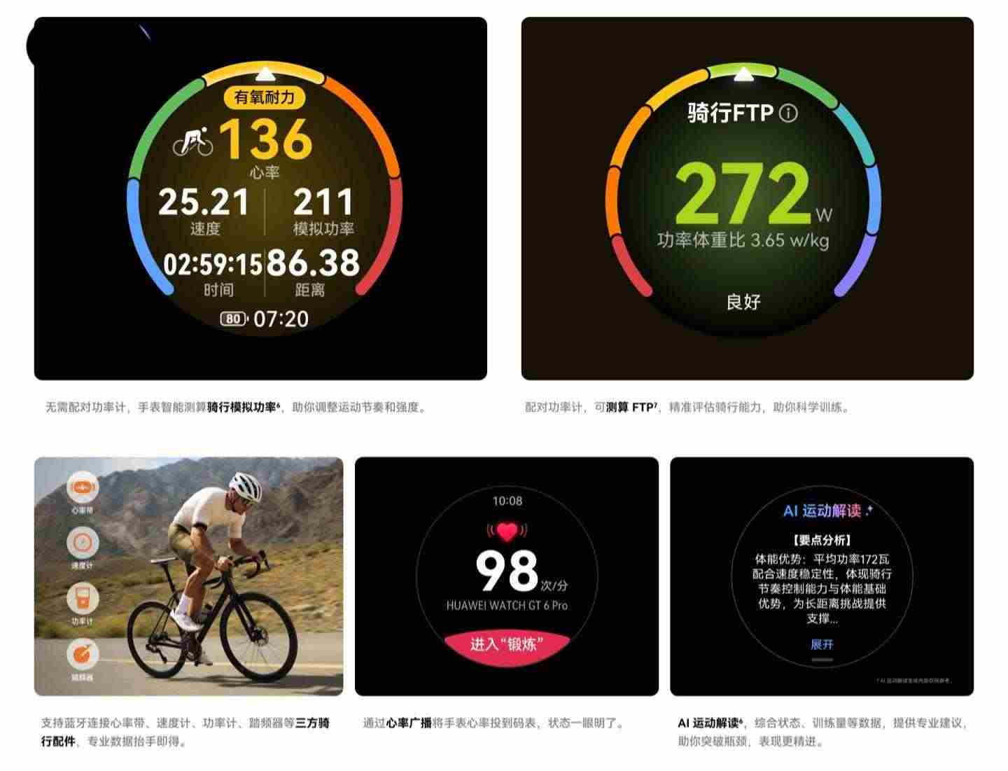 HUAWEI WATCH GT 6 支持蓝牙连接心率带、速度计、功率计、踏频器等三方骑行配件,可通过心率广播将手表心率投到码表。同时,HUAWEI WATCH GT 6 还支持 AI 运动解读,包含综合状态、训练量等数据,并提供专业建议。