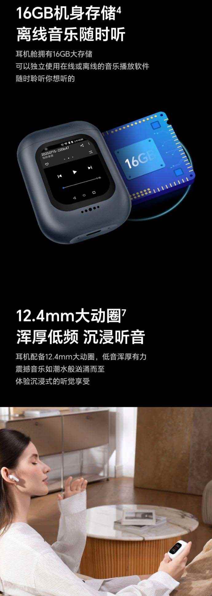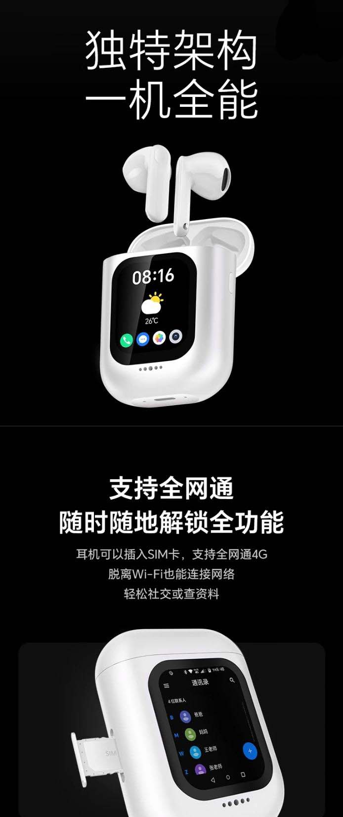 据介绍,这款耳机拥有星曜黑、星梦银两种配色可选,机身左侧内置 SIM 卡槽,可插入手机卡,实现脱离手机通话、网络通话等,支持全网通 4G,脱离 Wi-Fi 也能连接网络,轻松社交或查资料。