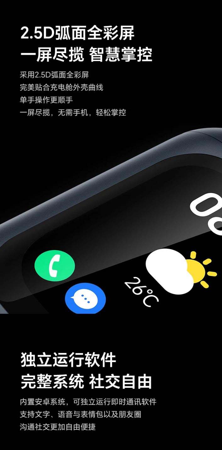 功能方面,这款耳机搭载安卓系统,可独立运行各种 App,内置 500 万像素摄像头,配合移动网络可实现双向视频通话,也可以拍照、录视频等,搭载 1.84 英寸微弧屏幕,支持独立运行“即时通讯软件”,配备 16GB 存储空间,可以下载音乐、存储聊天记录等。