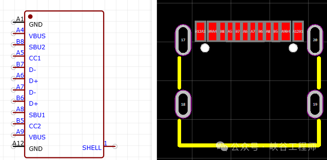 12 Pin的TypeC和16 Pin的TypeC的PCB封装可以做成一样的。原理图电路设计也是一样的: