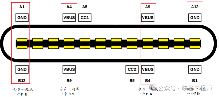 12P和16P其实是相同接口,12P的Type_C把四个VBUS的引脚并拢起来,四个GND的引脚也并拢起来,这样焊盘上就只需要12个脚,如下图: