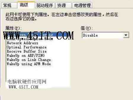 在该设置窗口的“高级”标签页面中,选中“属性”列表中的“Link Speed/Duplex Mode”选项(如图),并在该选项的“值”下拉列表中,为网卡选择一个合适的工作模式,并单击“确定”按钮就可以了。