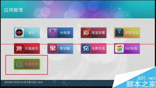 4、完成安装后,返回到主界面,进入“应用管理”,就能看到泰捷视频的图标了。连接好网络,打开泰捷视频就能收看800+直播电视频道和几万部点播视频了。