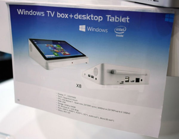 现在一款集一体机和平板电脑特色的跨界PC - Pipo X8 迷你PC已经发布。Pipo X8 迷你PC不是完全平坦状的平板电脑,但也不像一体机那样完全垂直。Pipo X8 迷你PC被称为Windows TV电视盒+桌面平板电脑。它缺乏内置的电池,因此不适合随身携带。Pipo X8 迷你PC可以像桌面电脑那样固定使用,它无需Windows许可费用,因为微软Windows 8 Bing操作系统对屏幕小于特定尺寸的设备免费。