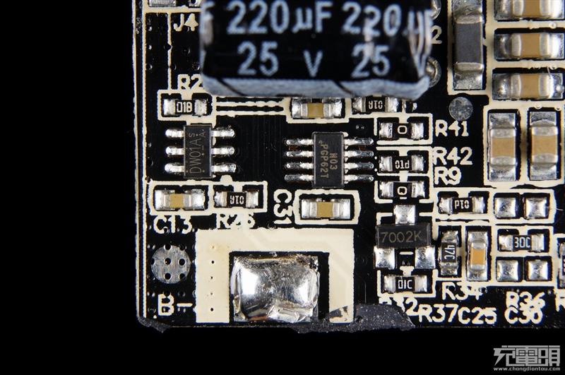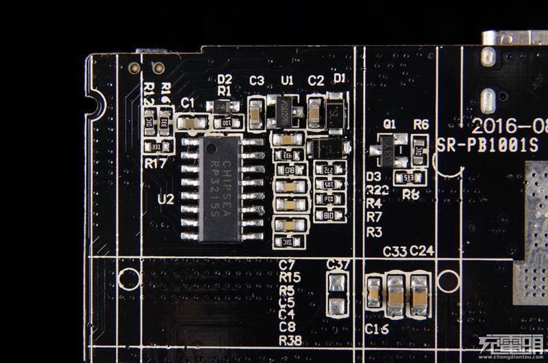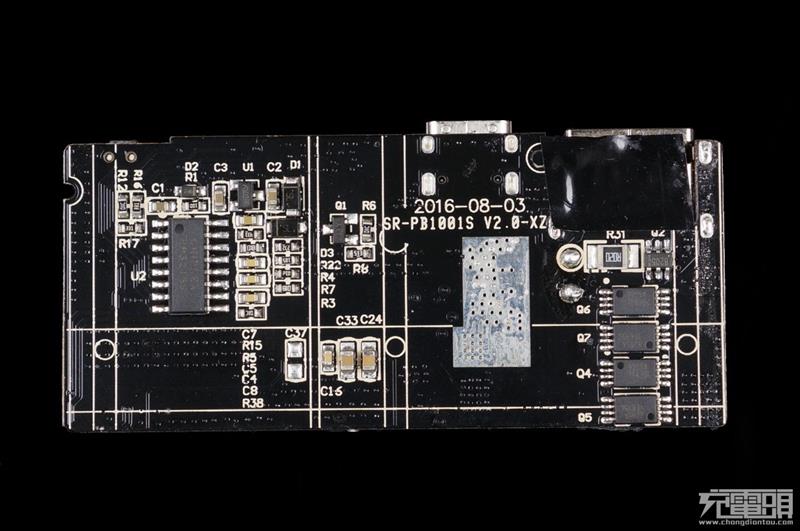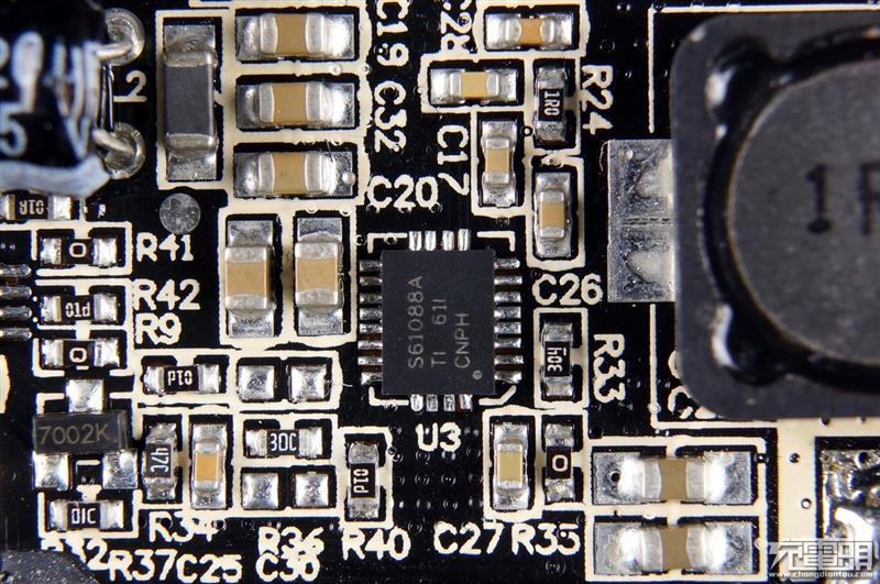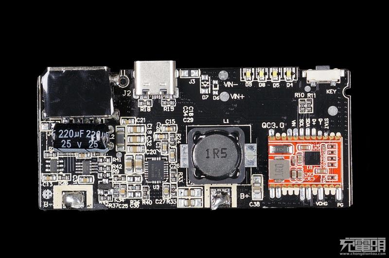此处该芯片做系统主控MCU,负责移动电源板子所有输入输出检测,各电路单元控制,安全保护,库仑计电量精确显示(目前移动电源上最高阶的电量精确显示技术),还有要和高通SMB1351通信控制充电等 。值得一提的是该芯片还支持TYPE-C输入协议,使用苹果的USB PD适配器可以给这款移动电源充电。