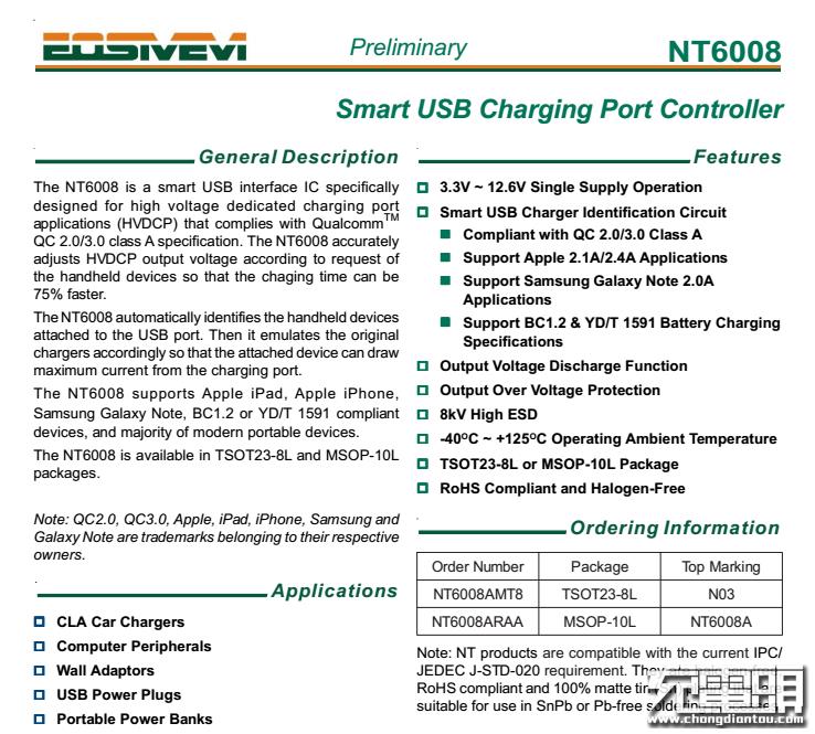 台湾曦威EOSMEM 出品的快充握手识别芯片 NT6008,是首批通过高通QC3.0认证的识别芯片,同时亦可以支持苹果设备正确识别达到满速。