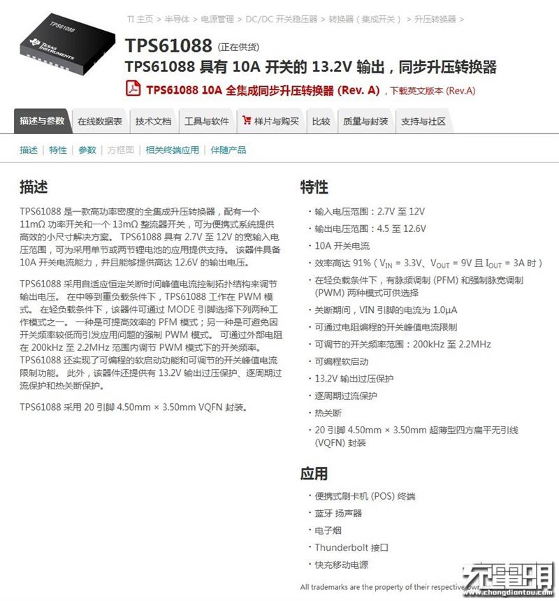 美国德仪TI TPS61088 同步整流升压芯片。这颗芯片采用20脚的VQFN进行封装,配有一个11mΩ功率开关和一个13mΩ整流器开关。输入也就是电池端支持单锂2.7V~多锂12V,输出电压范围4.5V~12.6V,5V9V12V通吃。具有10A的开关电流能力。查看下面的官方PDF效率值表,5V/9V/12V 在2A时都可以超过91%的板端效率值,甚为恐怖。是一颗高集成度超高效率低阻值的同步整流升压芯片。