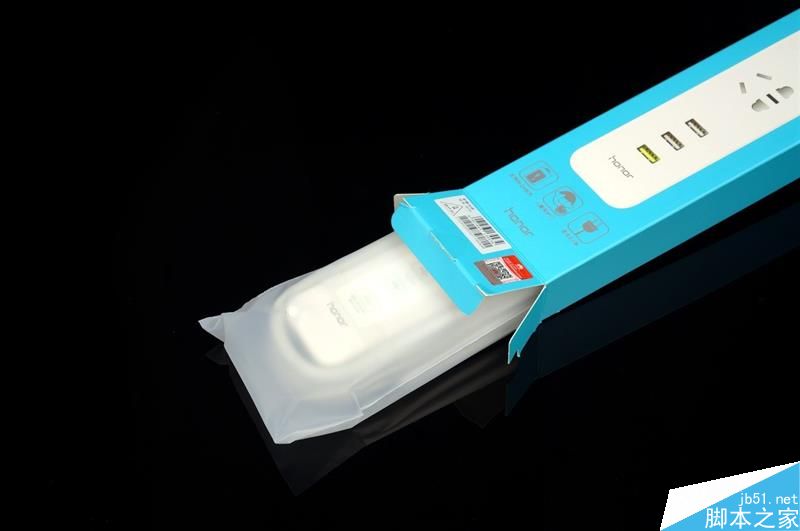 插线板采用天蓝色纸盒包装,上面印刷了荣耀AP35插线板式样,天蓝色的主色调与白色主色调包装盒的华为AP35有所不同。