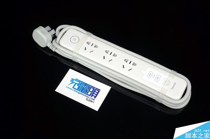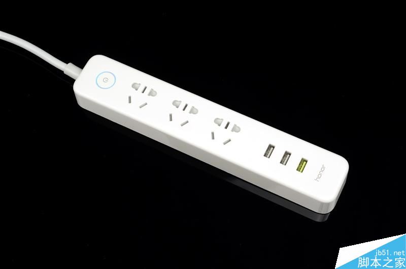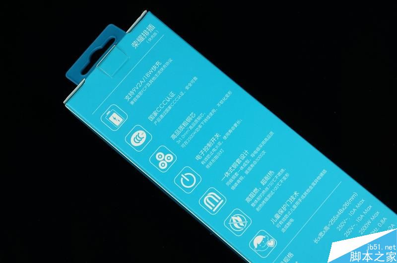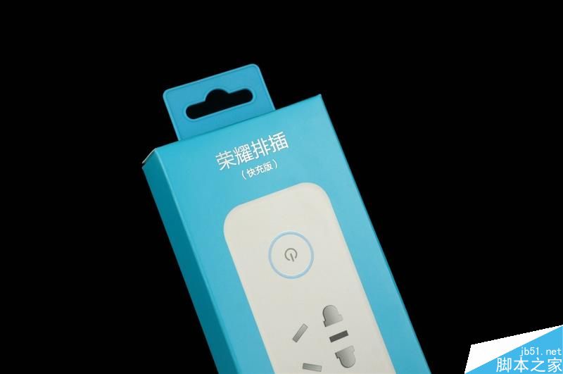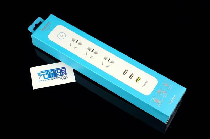 包装顶部荣耀排插下面用小字标注了(快充版),盒子上部带有塑胶挂孔方便上架销售,注明这是一款支持快充技术的插线板。