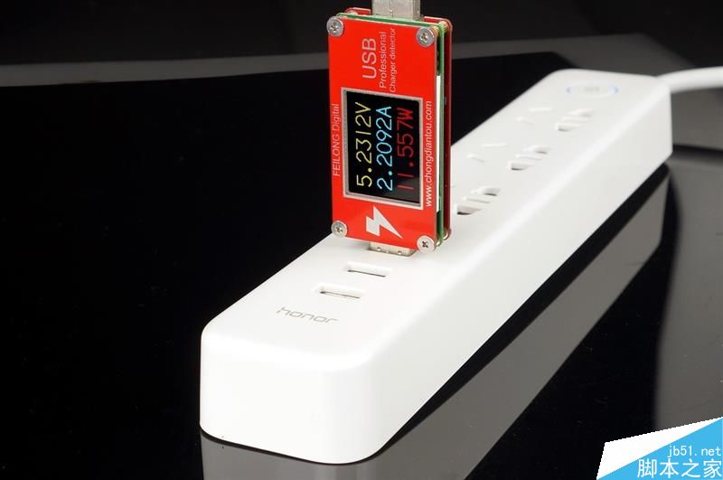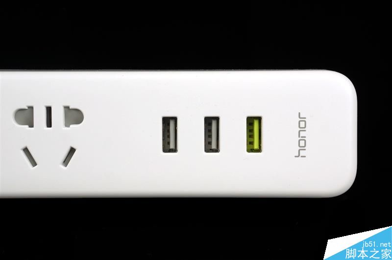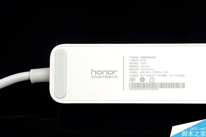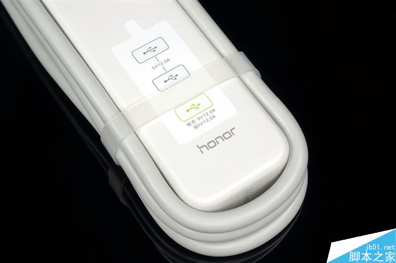 粗壮的线材被透明橡胶带捆扎起来更加工整,USB输出口上贴了一张防尘标识胶贴,标注了上面两个灰色USB口是5V2A输出,下面一个绿色USB口是9V2A/5V2A快充输出口,USB下方印有荣耀LOGO:“honor”。