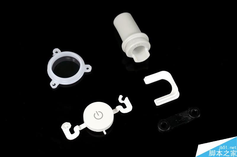 左上是半透明光环,左下是按钮盖,点击微动开关通电后蓝光就是在这个光环透出。右上个是线缆防折套、中间是相位环、下面黑色拧螺丝的是线缆压片。