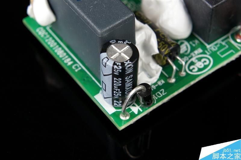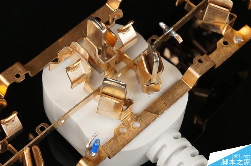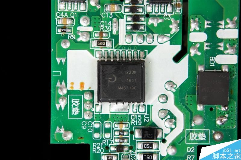 在焊线处,线材先通过冷压端子压接后再焊接到PCB上,更加牢固,整个插线板内部大量使用灌注白胶来抗震,避免日常使用时以外掉落造成元器件脱出松动,高低压隔离板可以避免以外窜电危险,隔离板做到了壳体上,所以PCB图片看不到。在变压器与SC1223K之间包裹着一层金属铁皮,起到均热与EMI屏蔽的作用。