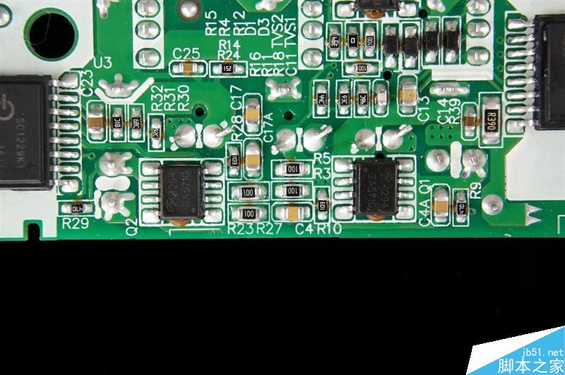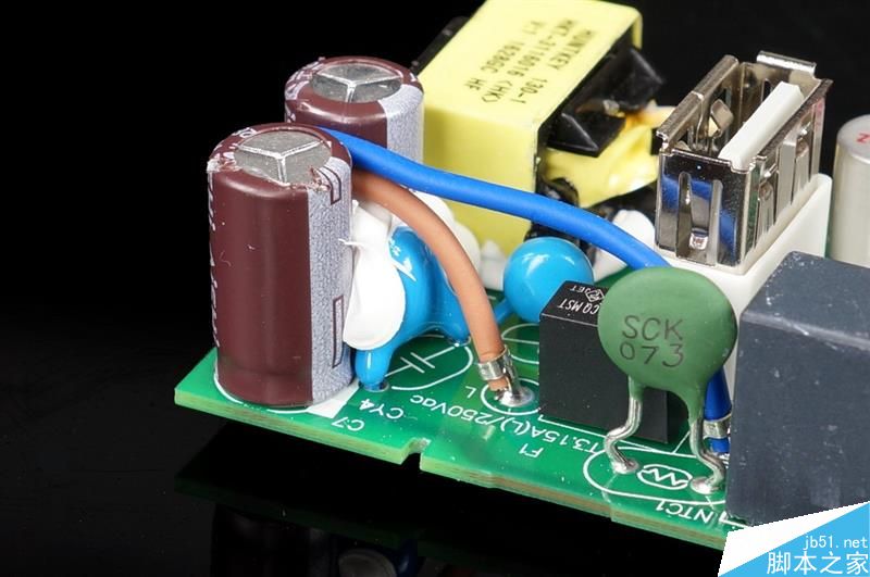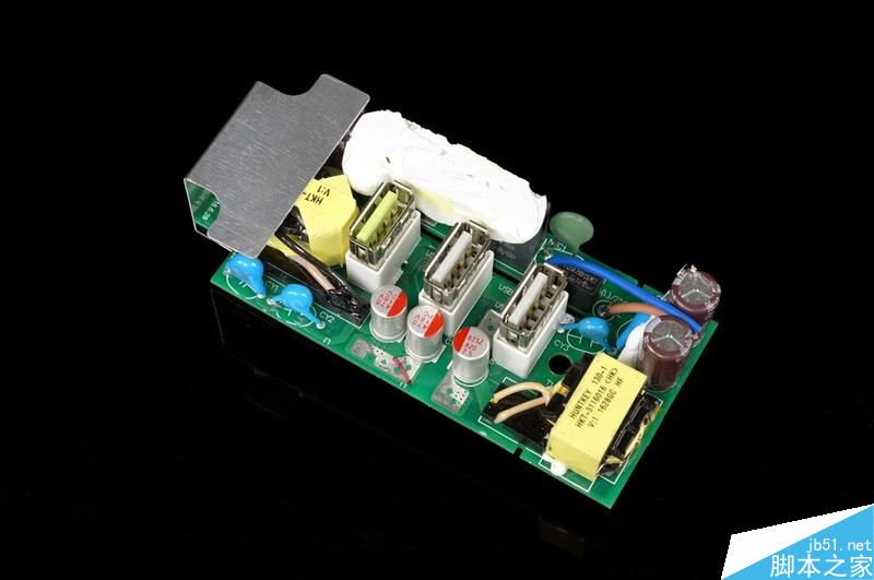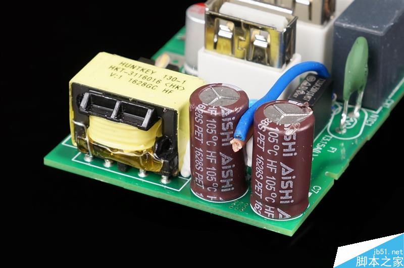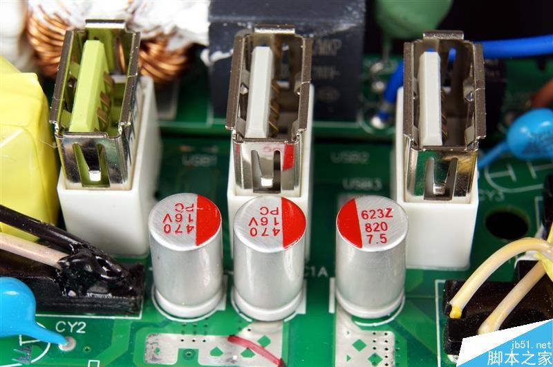 固态电容同样是来自AiSHi艾华,16V470uF x2 负责绿色快充口滤波,7.5V820uF负责普通5V口滤波,3个USB母座都没有磁吸反应,并且底座都有塑料套加固抵抗插拔摇晃。