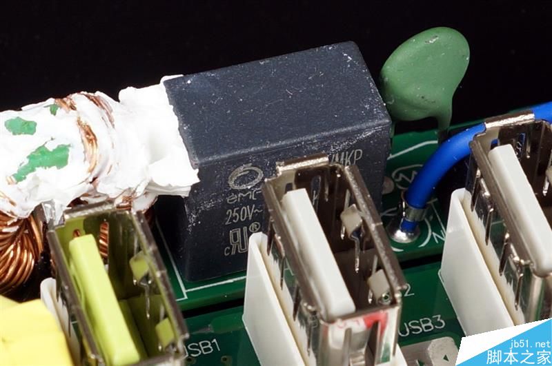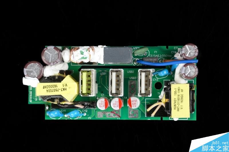 USB模块,在输入方面我们看到了一颗绿色的防浪涌ntc原件,有效避免插插线板电时给电容充电产生火花,还有阻燃保险丝加固安全防线,黑色x电容配合共模电感, 组成一级emi滤波电路,防止开关电源工作的高频噪声干扰其他用电设备。