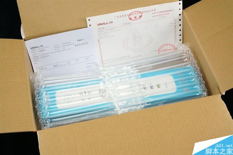 打开快递箱子,插线板用俗称红酒袋的气柱袋包裹起来,抗震效果一流。另外还能看到发货清单一张、机打发票一张。