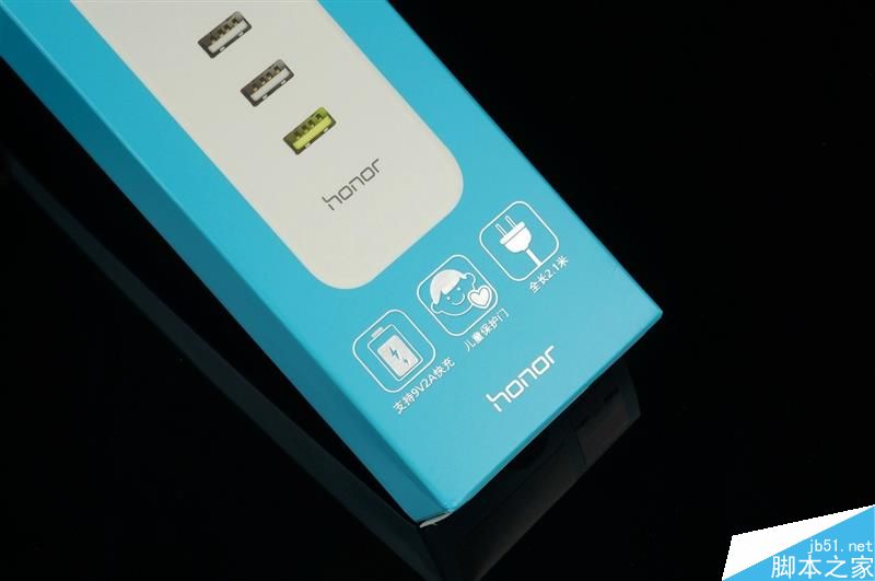 底部标注了几个产品特色参数,“支持9V2A快充”“儿童保护门”“全长2.1米”,还有荣耀英文LOGO“honor”。