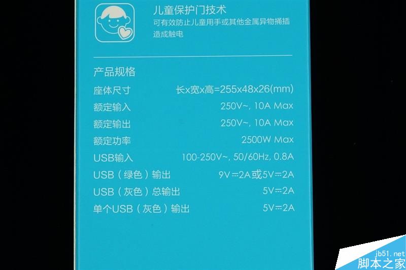产品铭牌规格参数,座体尺寸:255mmx48mmx26mm、额定输入:250V~10A MAX、额定输出:250V~10A MAX、额定功率:2500W MAX、USB输入:100-250V~,50/60Hz,0.8A、USB(绿色)输出:9V2A或5V2A、USB(灰色)输出:5V2A、单个USB(灰色)输出:5V2A。