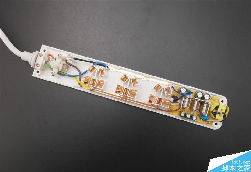 插座内部使用的一体铜条,外观上是黄铜,比起紫铜来说导电性稍差,但耐用性却要好上很多。
