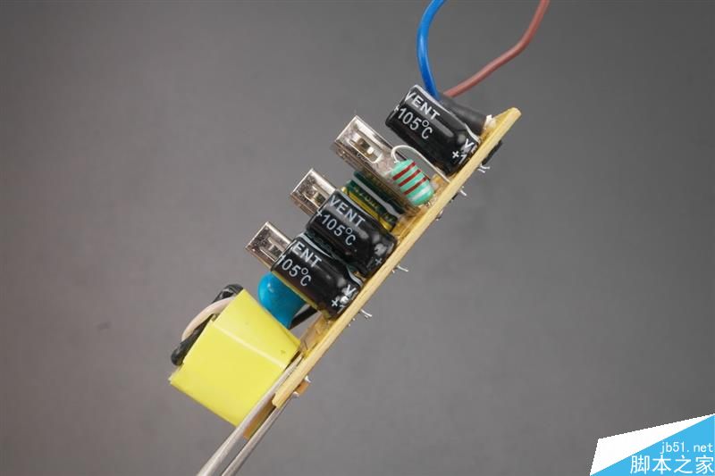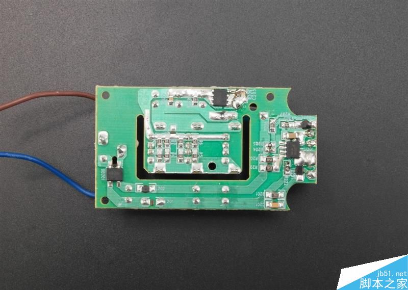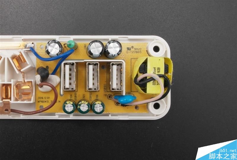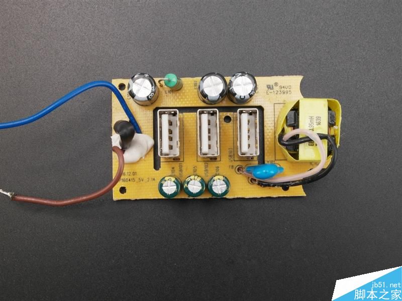 左边热缩管包裹的是保险丝,最右边是变压器。上方是输入滤波电解电容,下方是USB口输出滤波电容,蓝色是跨接在输入与输出端的安规电容。