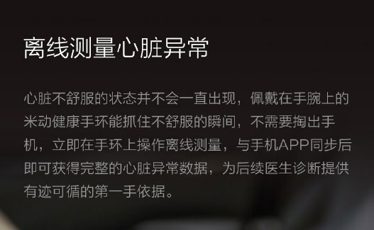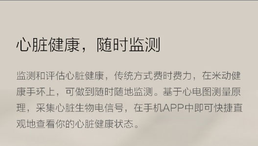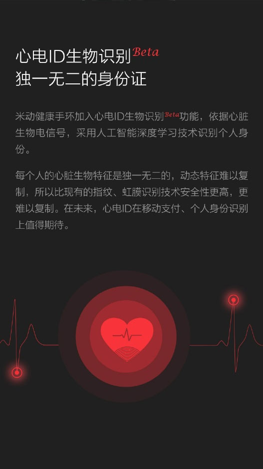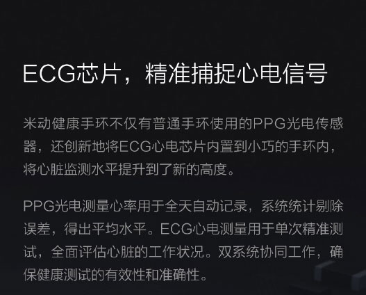 按照官方说法,AMAZFIT米动健康手环内置ECG芯片(医院用来测心电图),可随时随地监测心血管健康状况,进行心电ID身份识别。