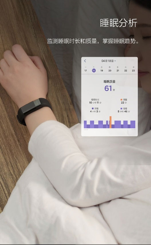 同时,AMAZFIT米动健康手环内置三轴加速度传感器+PPG光电传感器,24小时不间断测量心率数据,通过监测睡眠规律性、睡眠时长、深睡眠比例、夜里醒来次数和时间等因素来可观反应睡眠质量。