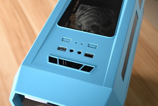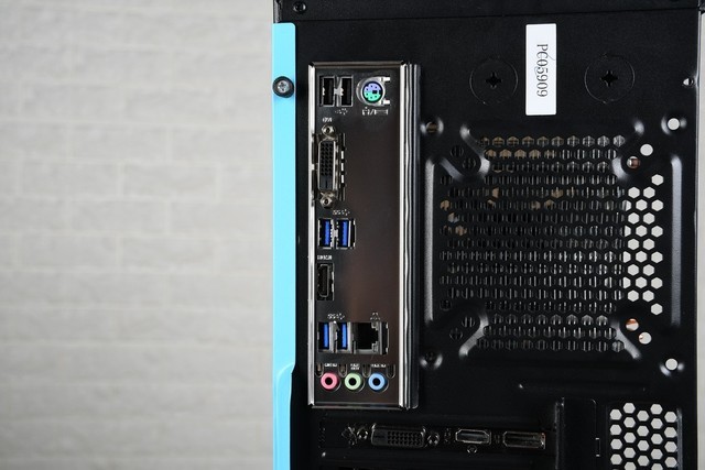 战蓝系列电脑机箱顶部机箱顶部预留了四个UBS接口,战蓝主机提供了USB 2.0*1+USB 3.0*1以及前置耳机麦克风插孔,剩余面积留给了机箱风扇散热格栅,其主板一侧的侧板还设计了可翻折收纳的辅助拆装架,颇为贴心。在后面,战蓝系列电脑所搭载的主板提供了2X USB 2.0、4X USB 3.0、RJ45网卡接口、DVI视频接口、PS2键鼠接口、HDMI视频接口和音频输入输出插孔。综合外接和输出能力并不俗。