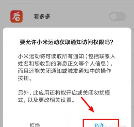 点击后,下方会提示我们开启小米运动通知读取权限,点击确定。