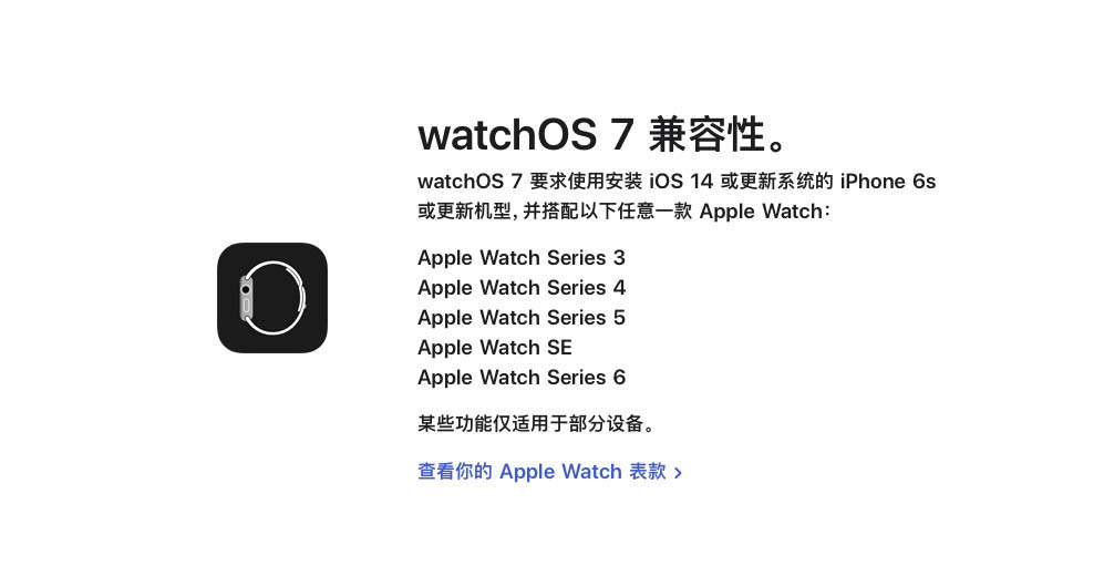 4、有的朋友可能会问,我的苹果手表比较老了,能支持最新的watchOS 7吗?从Apple Watch Series 3 到最新的Apple Watch Series 6都是支持的。