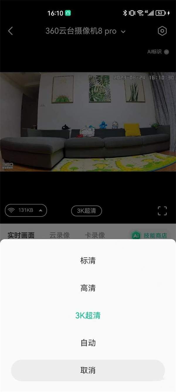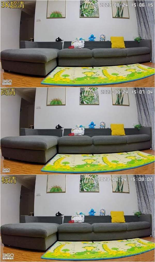 在图像质量方面,360云台摄像机8Pro Al版提供了3K超清、高清、标清和自动四种分辨率选项。摄像机采用高性能图像传感器和ISP画质调教算法,具备500W像素、F12.0大光圈和3K(2880×1614)分辨率,能够呈现出细腻、清晰的图像,并准确还原色彩,让我们能轻松查看家中各个细节。