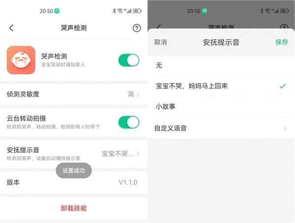 特别对于家中有小宝宝的家庭来说,该摄像机的哭声检测非常敏感。一旦摄像机识别到宝宝的哭声,会立即发出消息提醒,以便我们及时照顾宝宝。如果我们暂时无法走开,还可以设置安抚语句如“宝宝不哭,妈妈马上回来”,或者让摄像机讲故事来分散宝宝的注意力。