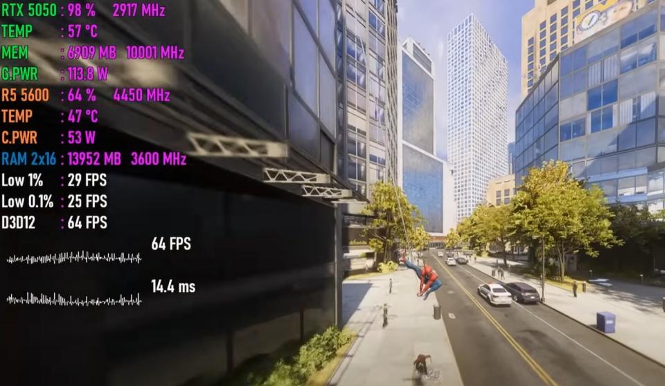 平均帧速为64 FPS,最低瞬时帧速为29 FPS,帧时间为14.4ms,CPU使用率为64%,功耗为53W,温度为47℃,内存使用量为14.0GB,GPU使用率为98%,显存使用量为6.9GB,功耗为114W,温度为57℃。