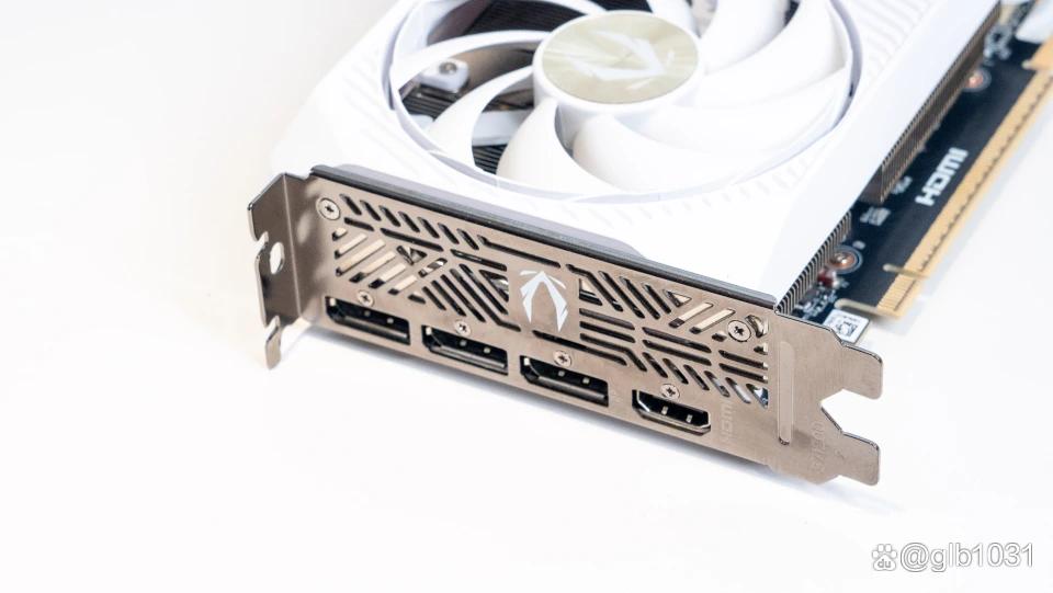 金属背板自然也是标配,白色的金属背板点缀金色装饰效果。显卡的尾端同样做了栅格化的镂空处理,进一步优化气流风道。
