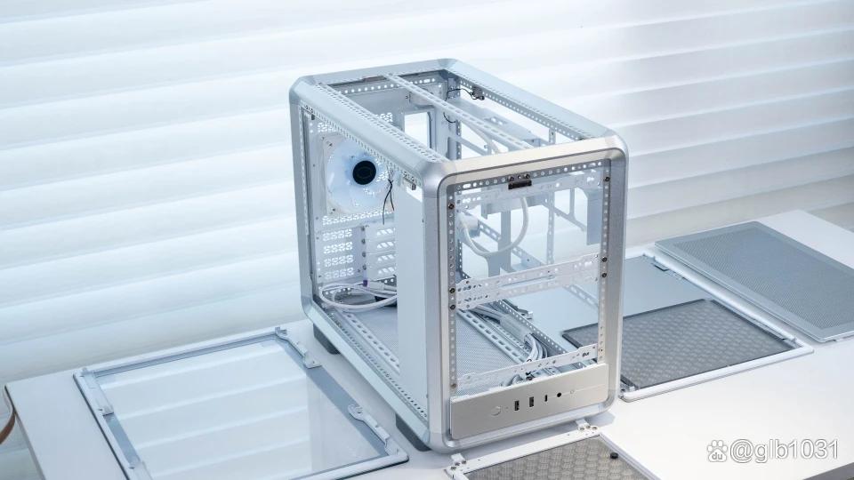 机箱整体各面板均采用磁吸式快拆设计,拆卸方便。拆掉之后可以看到整体铝制框架结构。