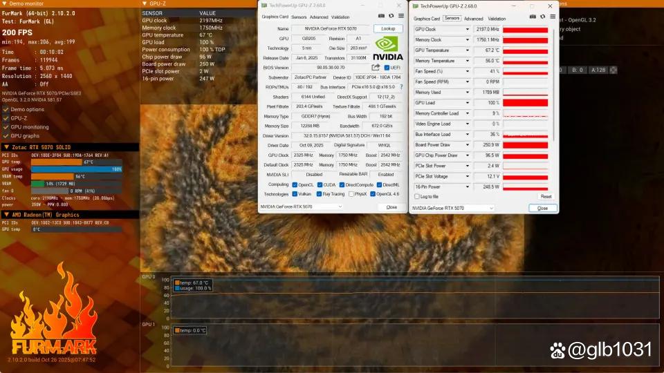 在机箱前20cm+后12cm风扇散热情况下,索泰 RTX 5070 SOLID CORE OC WHITE显卡的Geeks3D FurMark 显卡单烤测试,GPU频率2197 MHz,显卡TDP 250 W,显卡核心温度 67.2 ℃。