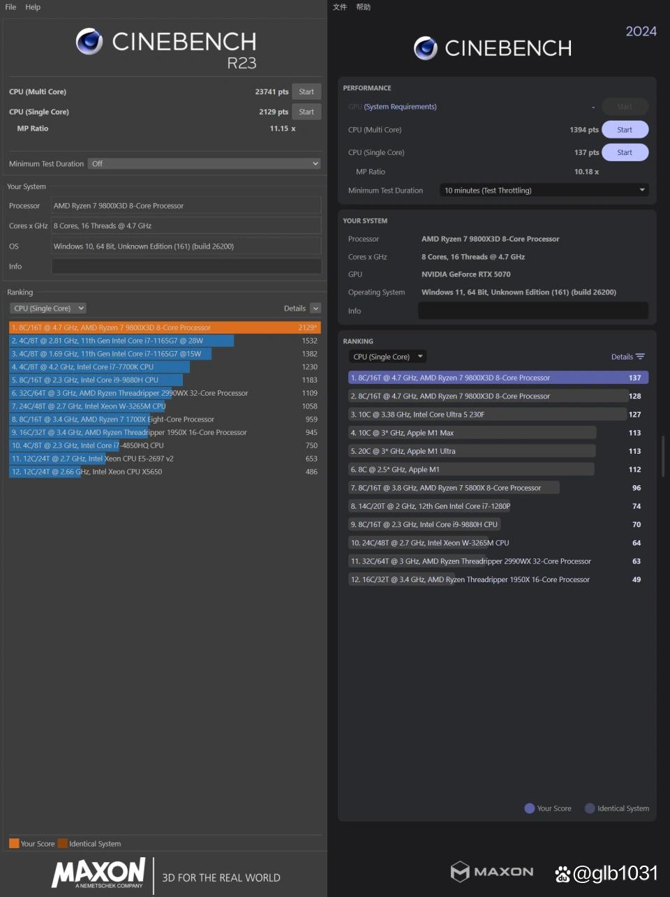 - 「CINEBENCH R23」:单核 2129 pts,多核 23741 pts