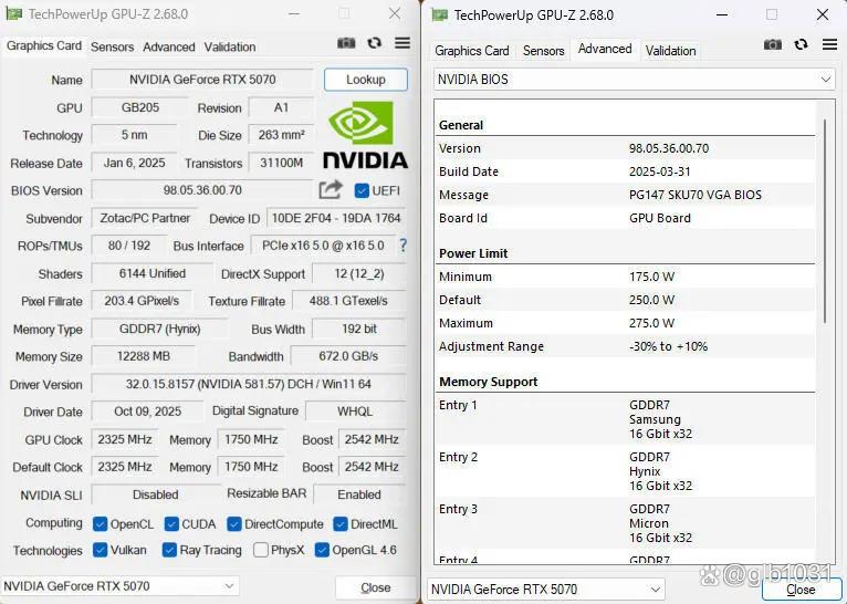 索泰 RTX 5070 SOLID CORE OC WHITE显卡通过GPU-Z查看具体参数。