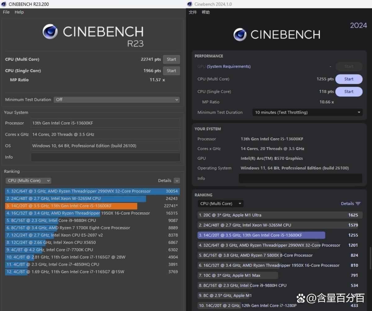 酷睿i5-13600KF在CINEBENCH R23下的基准测试结果如下,默认参数下的多核测试结果为22741pts,单核测试结果为1966 pts;在CINEBENCH 2024下的基准测试结果如下,默认参数下的多核测试结果为1255 pts,单核测试结果为118 pts。