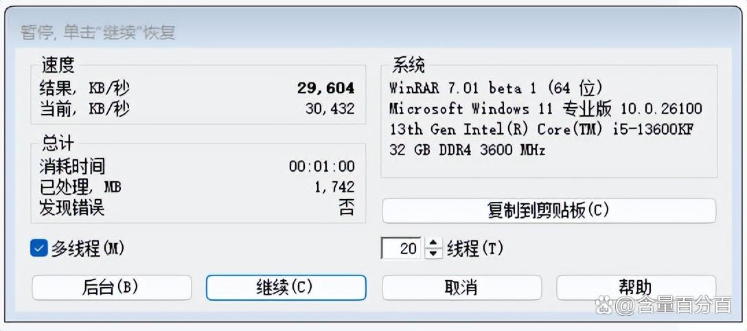 搭配WINRAR基准测试的时长选择了1分钟,对应的测试结果为29604 KB/s。