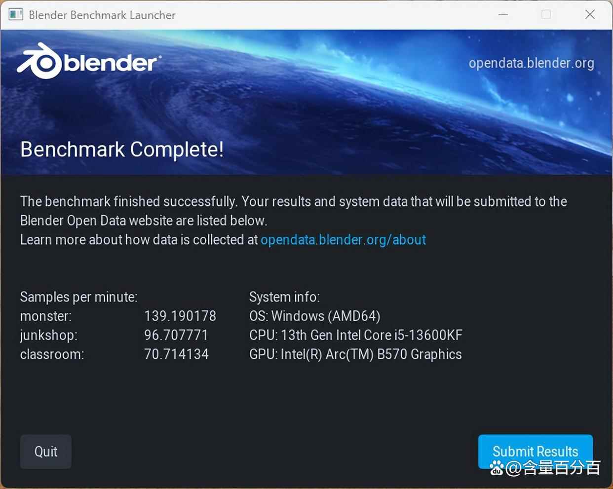 主机在Blender Benchmark下的测试结果如下,monster对应的数据为139.190178,junkshop对应的数据为96.707771,classroom对应的数据为70.714134。